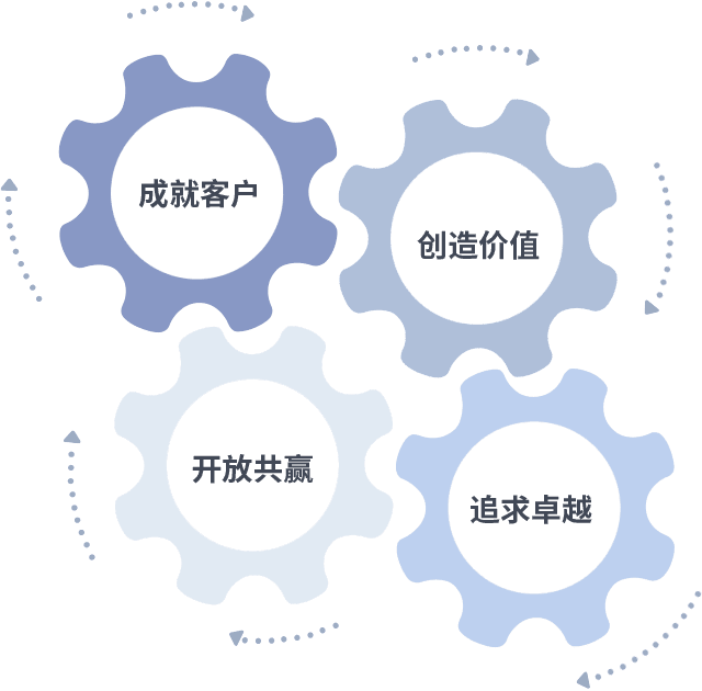成就客户是一切决策的出发点,,,,创造价值是衡量所有工作的标准,,追求卓越是我们做事做人的态度,,开放共赢是我们的格局也是最终的结果。。。。价值观的齿轮环环相扣,,推动着组织里的每个人不断向前。。